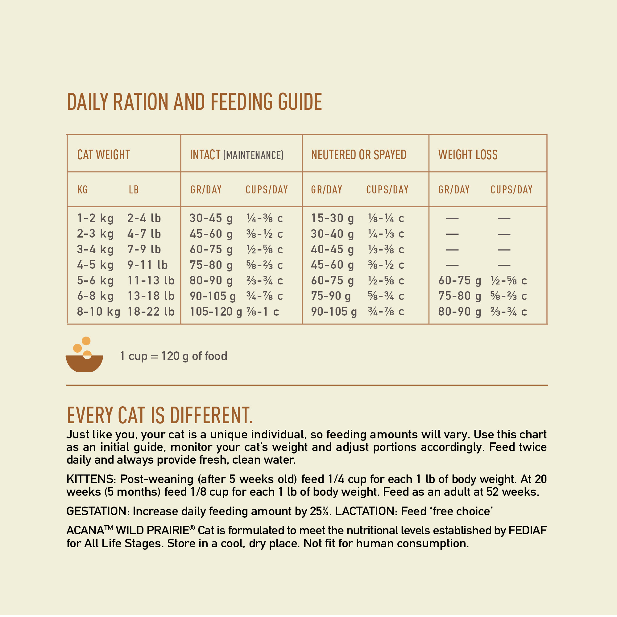 Kiekviena katė yra unikali ir individuali, todėl ir jų šėrimo reikalavimai skiriasi priklausomai nuo veislės, aplinkos, amžiaus ir aktyvumo. Štai kodėl rekomenduojame naudotis šiomis maitinimo normomis kaip atskaitos tašku bei stebėti savo katės svorį ir reguliuoti davinius tiek, kiek reikia. Rekomenduojama maitinti jį du kartus per parą ir visada palikite šviežio švaraus vandens atsigerti.