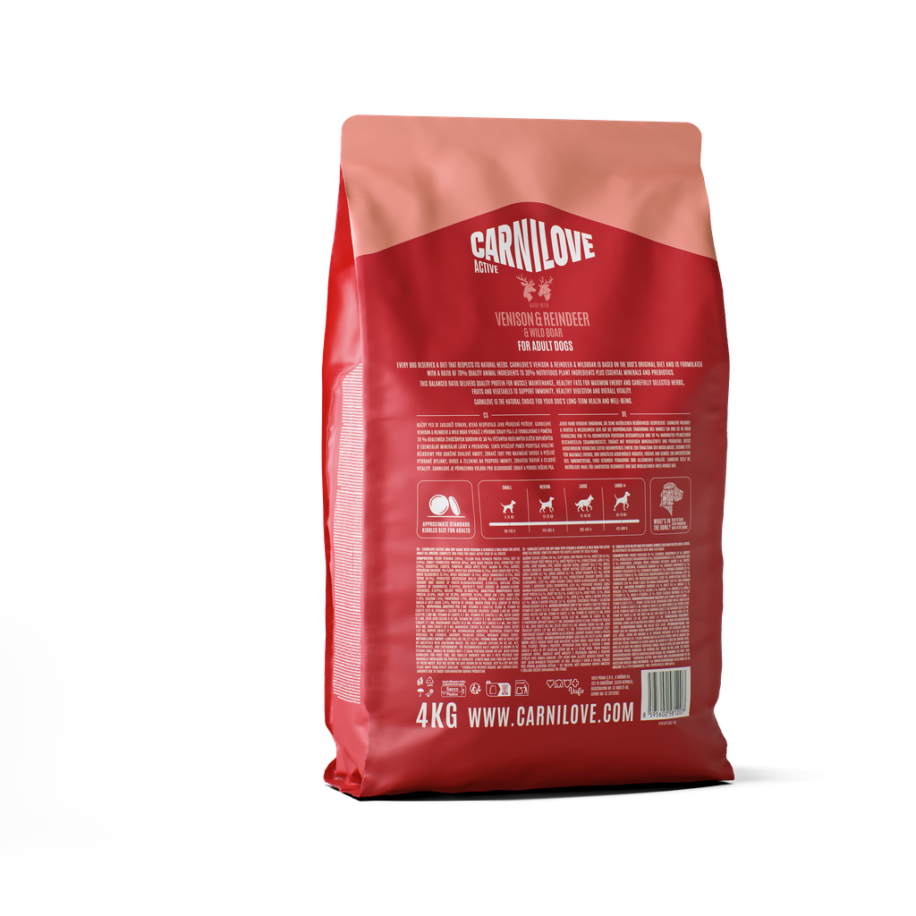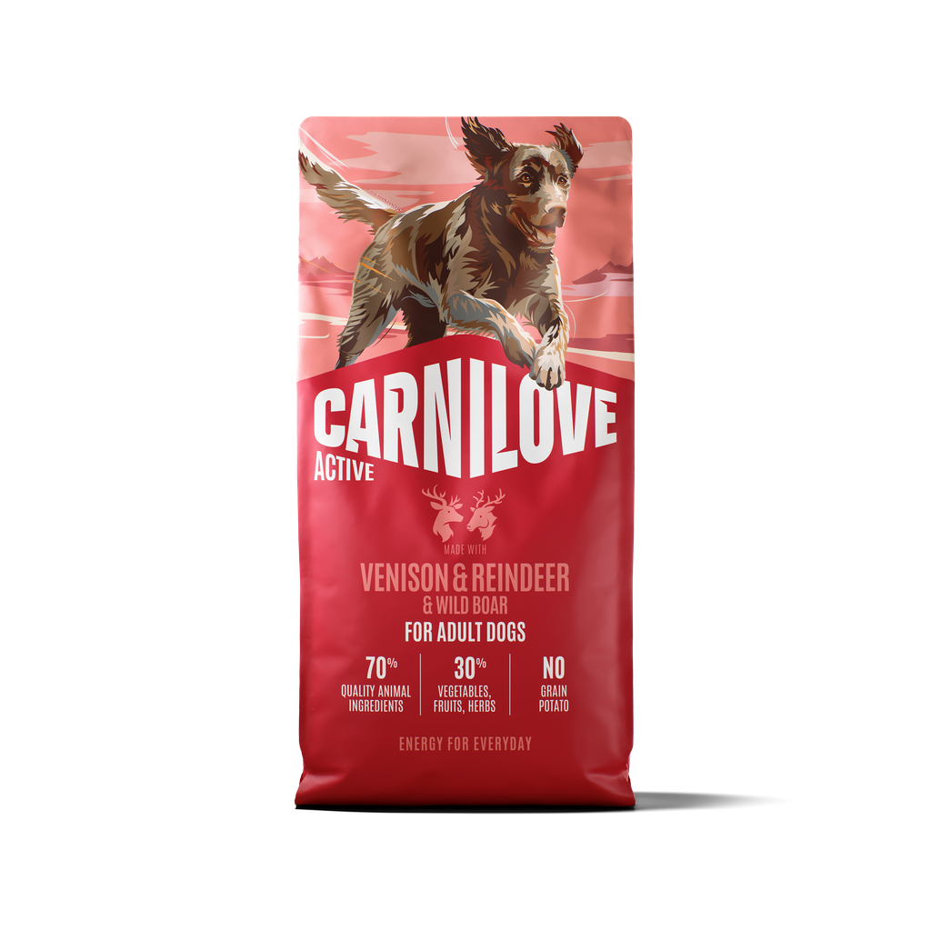 - Sukurta labai aktyviems šunims – didelės vertės elnienos, šiaurės elnio ir šernienos baltymai suteikia nepakeičiamų aminorūgščių ir koncentruotos energijos.