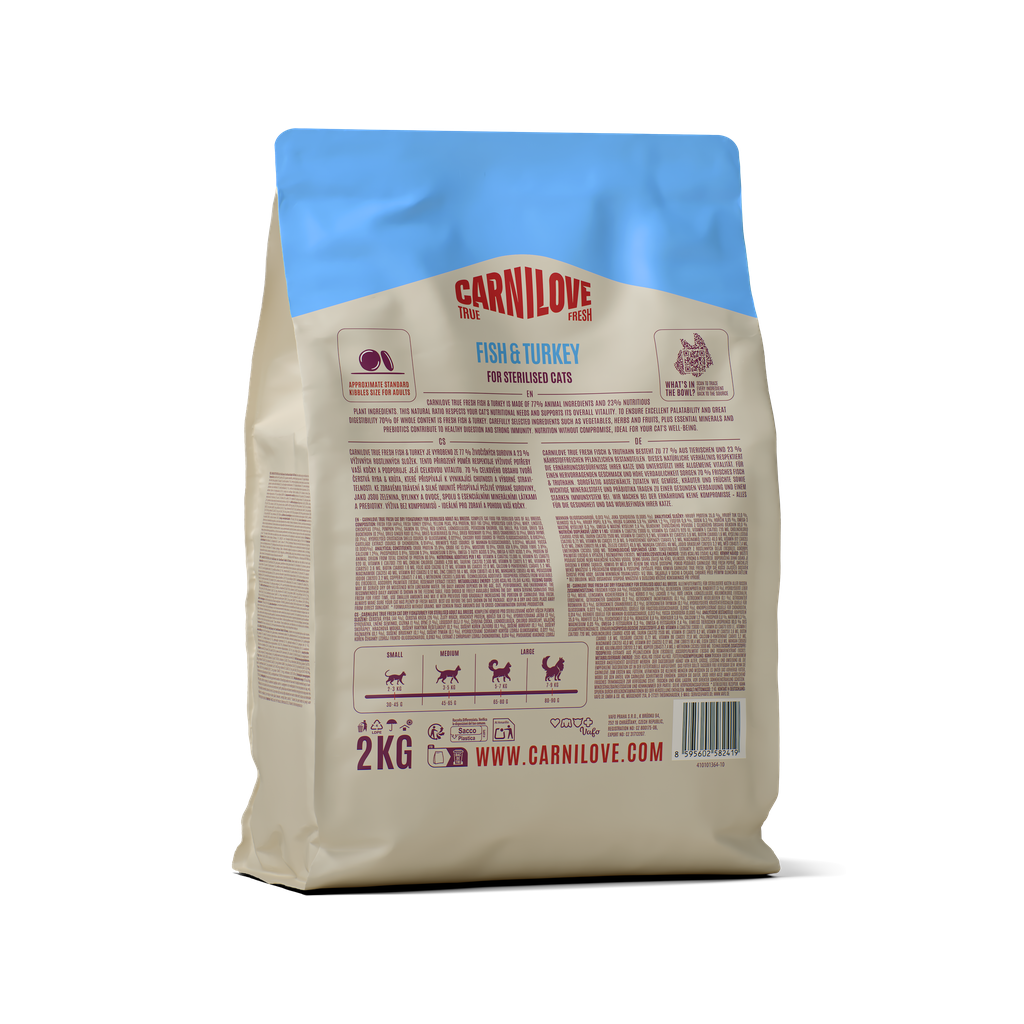 Visavertis pašaras suaugusioms sterilizuotoms visų veislių katėms su žuvimi ir kalakutiena. Be grūdų ir bulvių. Be vištienos mėsos ir riebalų.